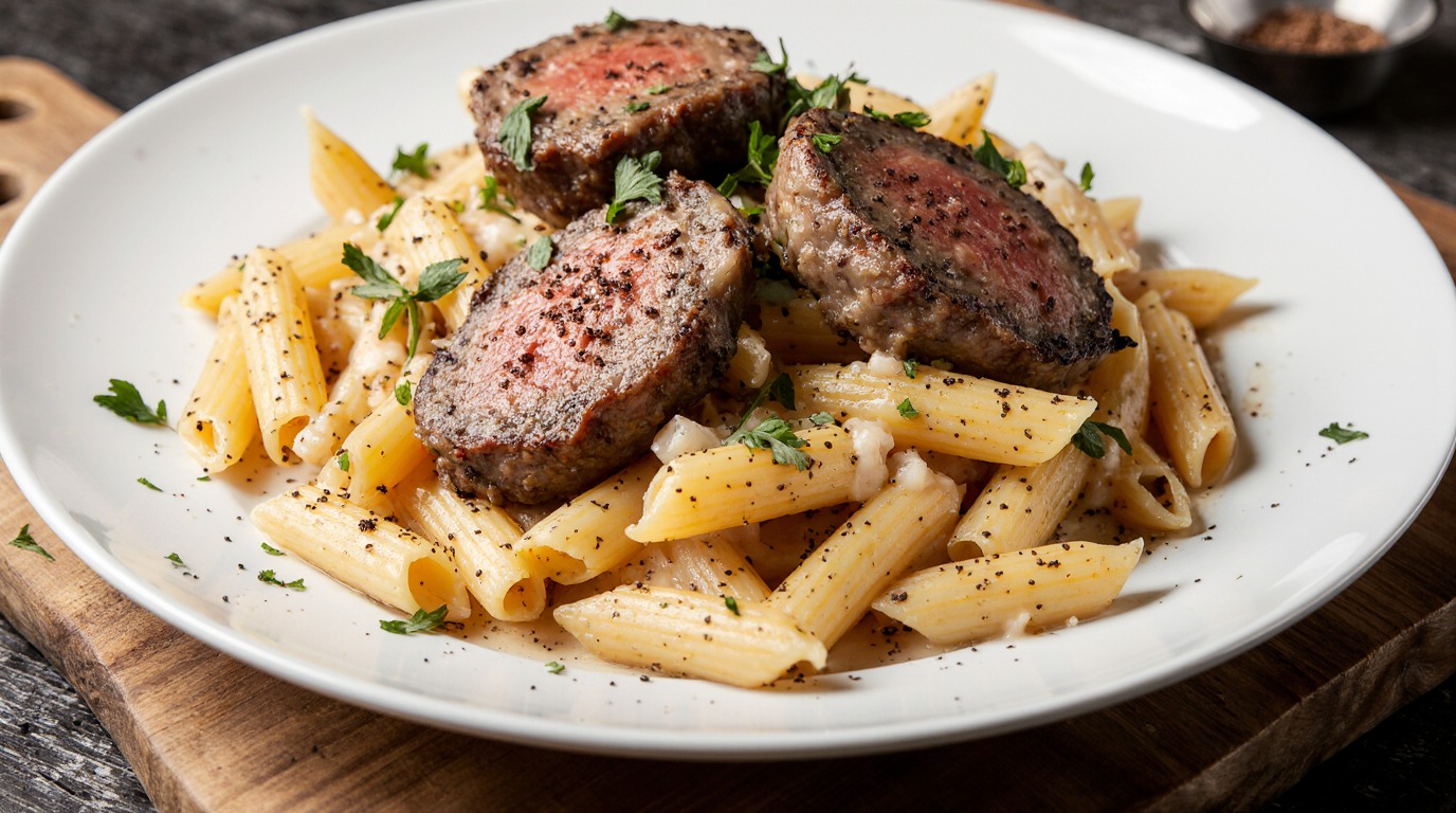 Creamy Garlic Parmesan Penne with Seared Steak Medallions is a rich and comforting dish that brings together soft pasta, juicy steak, and a smooth creamy sauce. This recipe is all about balance. You get the strong flavor of garlic, the salty and nutty taste of parmesan cheese, and the tender texture of steak that melts in your mouth. The penne pasta holds the sauce very well, making every bite full of flavor. This dish looks fancy but is actually simple to make at home, even if you are new to cooking. It is perfect for anyone who wants to enjoy restaurant style food without leaving their kitchen.