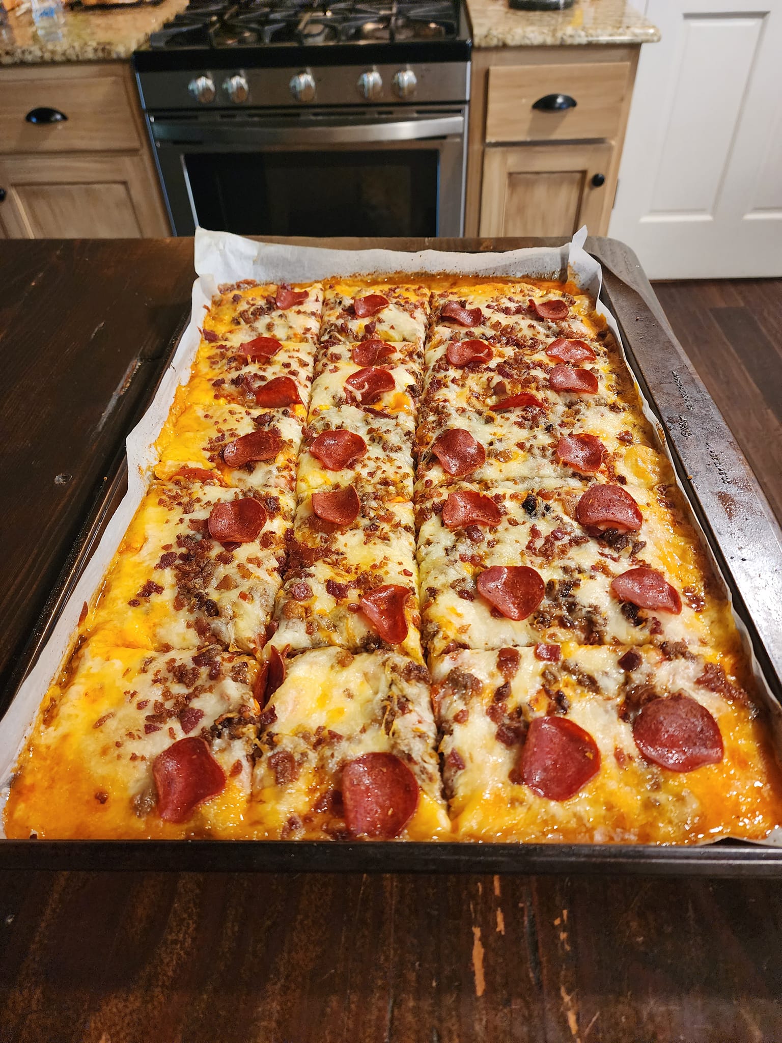 Crustless Pepperoni Pizza Bake is a simple and comforting dish that brings all the flavors of pizza without using traditional dough. This recipe is perfect for people who love pizza but want something easier and quicker to make at home. Instead of a crust, this dish uses a rich base made from eggs, cheese, and meat, which creates a soft and satisfying texture. The top is covered with melted cheese, pepperoni, and flavorful sauce, making every bite taste like a classic pizza. It is baked in a pan and then sliced into pieces, just like a regular pizza, but with a unique twist that makes it even more interesting.